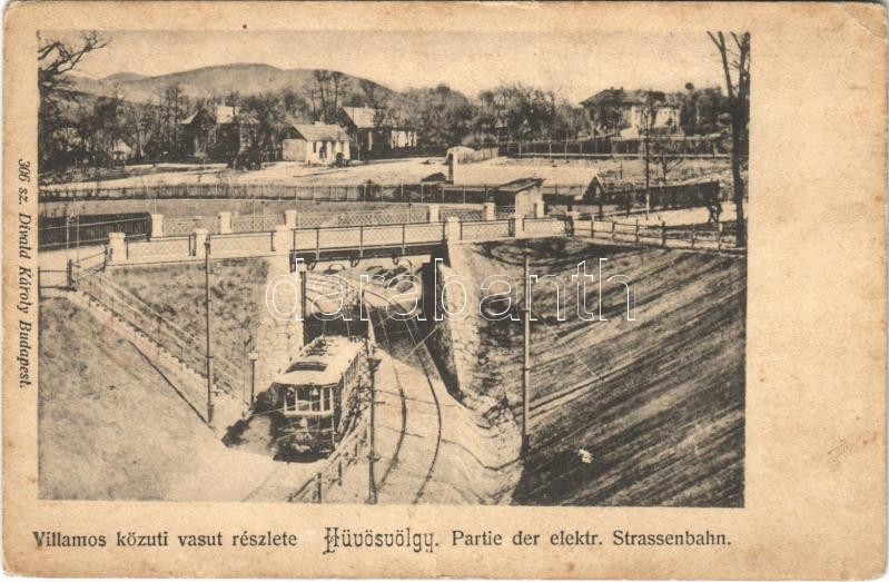 Leírás: Budapest II. Hűvösvölgy, villamos közúti vasút részlete. Divald Károly 306. sz. (r)