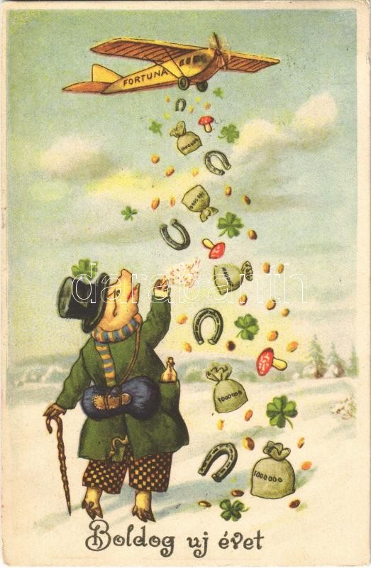 1935 Boldog Újévet! / New Year greeting art postcard with pig, airplan... https://www.darabanth.com/hu/399-Gyorsarveres/399.0/Kepeslapok/Udvozlolapok-Unnepek~1000088/1935-Boldog-Ujevet-New-Year-greeting-art-postcard-with-pig-airplane-horseshoes-and-clovers-L~II2432279