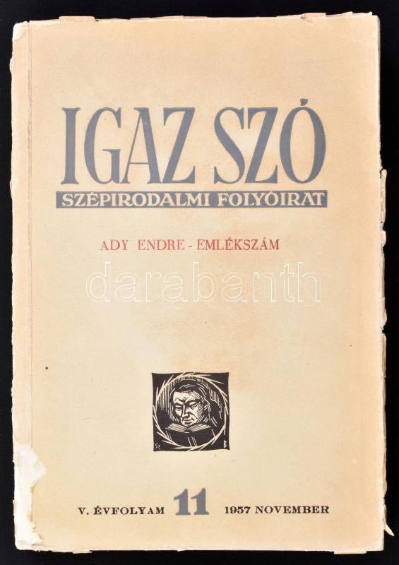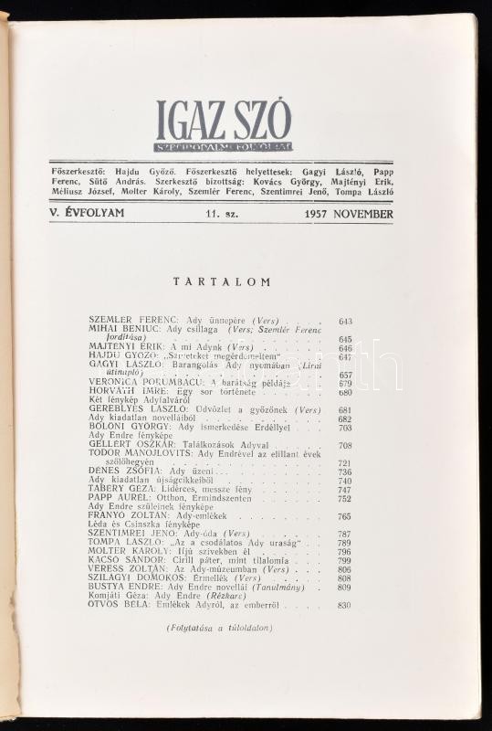 Igaz Szó. Szépirodalmi Folyóirat. V. évf. 11. sz. 1957. nov. - Ady Endre emlékszám. Marosvásárhely, 1957, Román Népköztársaság Írószövetsége. Papírkötésben, sérült gerinccel és szakadozott borítóval, kissé laza kötéssel.