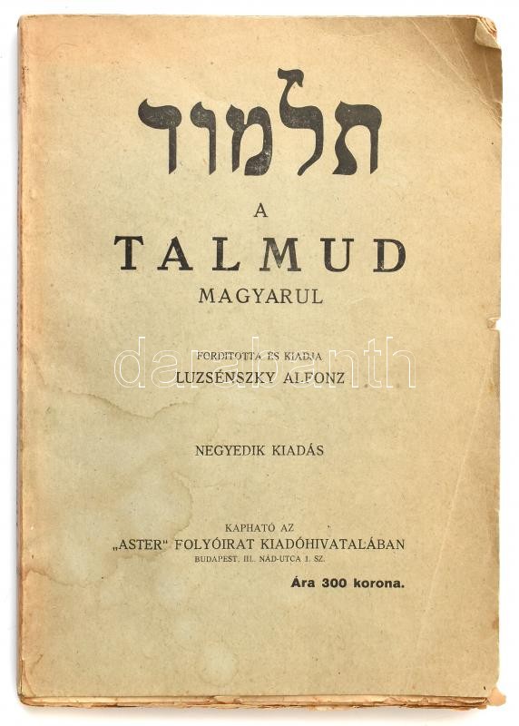 Leírás: A Talmud magyarul. Ford.: Luzsénszky Alfonz. Bp., 1922,Aster negyedik kiadás. Kiadói papírkötés, folttal a borítón