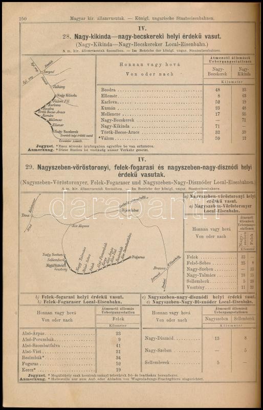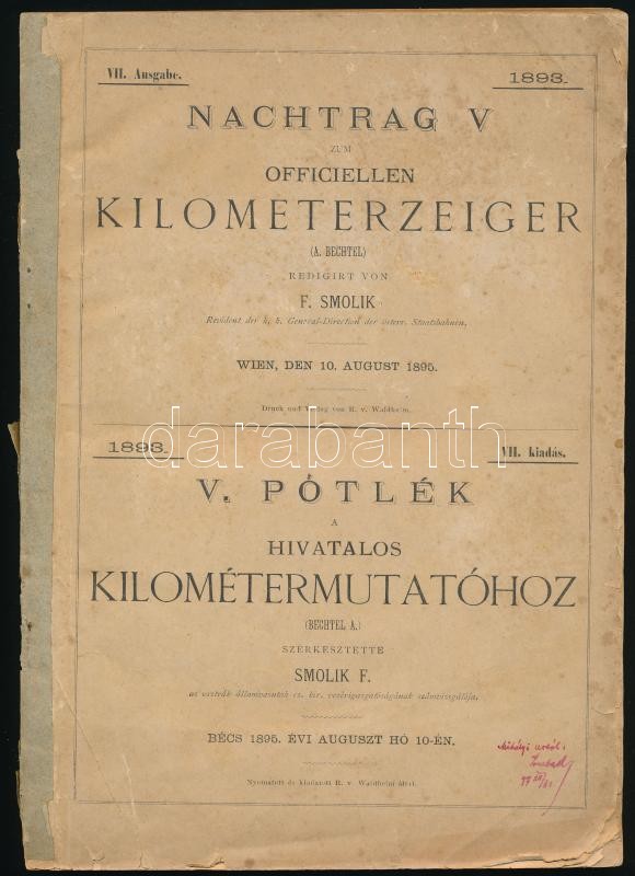 1895 V. Pótlék a hivatalos kilométer-mutatóhoz. Szerk.: Smolik F. Bécs, 1895, R. v. Waldheim-ny., XV+180 p. Az utolsó két lapon lyukkal, sérüléssel, kissé foltos borítóval, hiányzó hátsó borítóval, aláhúzásokkal. Benne a M. Kir. Államvasutak vasúti állomások betűsor szerinti jegyzékével, a 138-159 oldalak között szövegközti térkép vázlatokkal is.