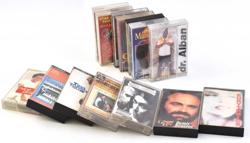 14 db audio zenei műsoros kazetta: Queen: Live at Wembley '86, Animal Cannibals: Fehéren fekete, Demis Roussos: Greatest hits, Eurythmics: Be Yourself tonight, Tina Turner: Simply the best, Julio Iglesias (2 db), stb.