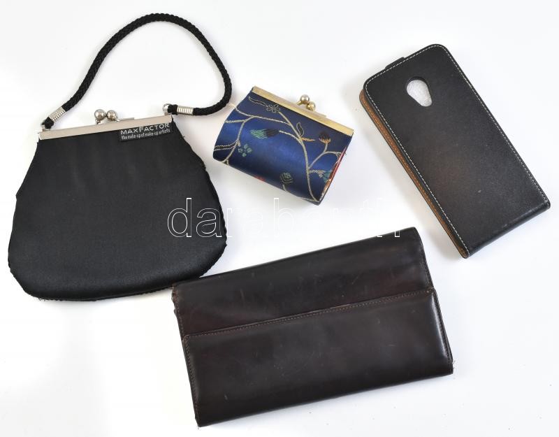 Leírás: 3 db különböző tárca, szövet és műbőr, használt állapotban + műbőr telefontartó tok