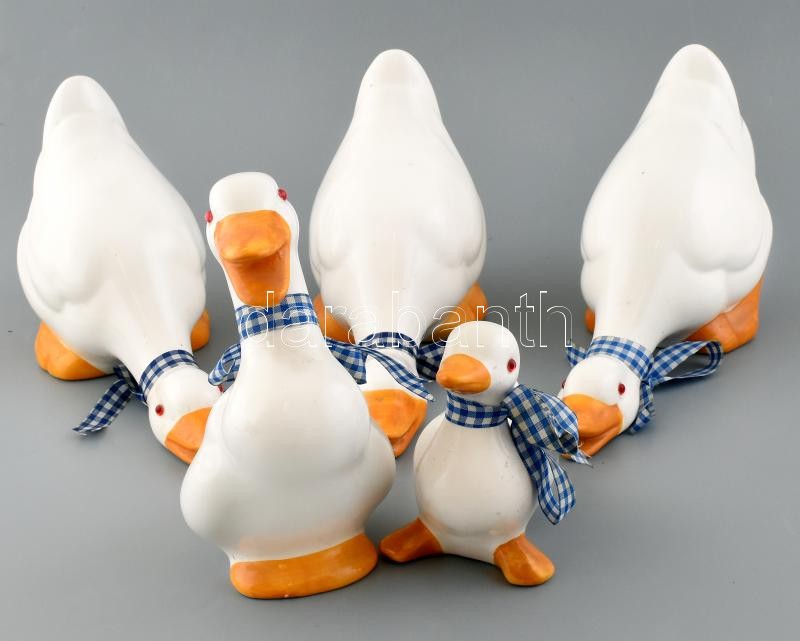 5 db fajansz kacsa, apró kopásokkal. m: 12,5 és 20 cm között. https://www.darabanth.com/hu/399-Gyorsarveres/399.0/Mutargy-papirregiseg-egyeb/Bolhapiac~500014/5-db-fajansz-kacsa-apro-kopasokkal-m-12-5-es-20-cm-kozott~II2444701
