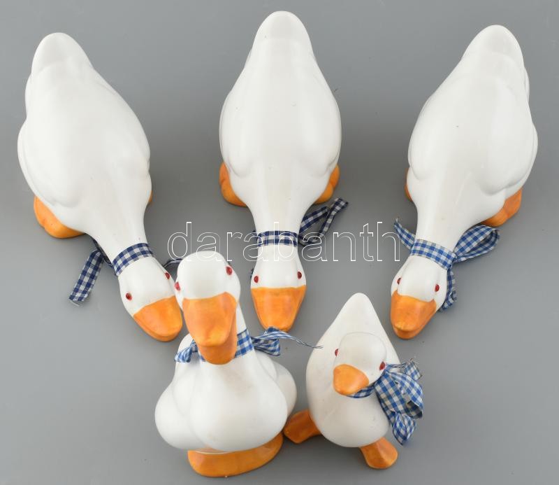 Leírás: 5 db fajansz kacsa, apró kopásokkal. m: 12,5 és 20 cm között.