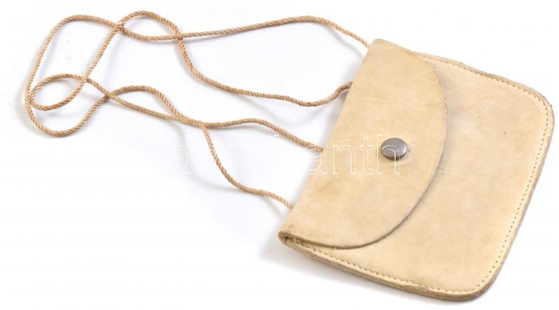 Leírás: Bőr nyakba akasztható tárca, kis kopásnyomokkal, 9×7 cm