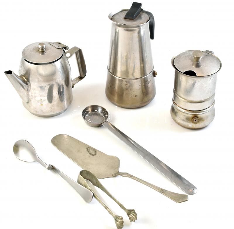 Leírás: Fém konyhai eszközök: kotyogós kávéfőző, kiöntő, tortalapát, kanalak, stb., összesen 7 db, kopottas állapotban