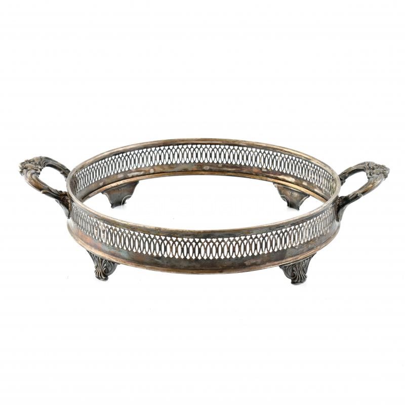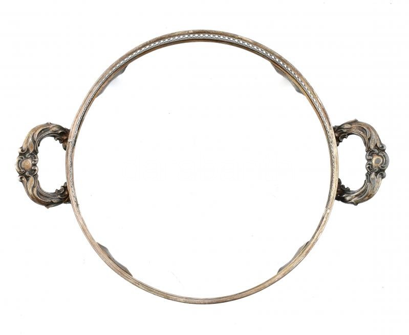 Leírás: Kerek tálca betét nélkül, ezüstözött alpakka, kopott, d:34cm