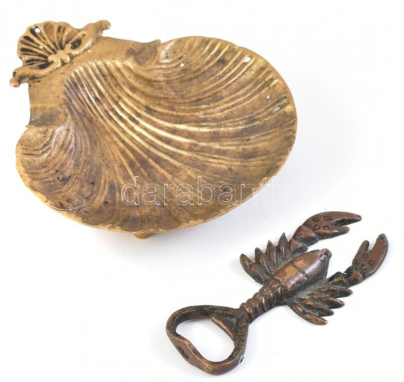 Leírás: Rákos réz sörnyitó és kagylót utánzó hamutál, 2 db, jó állapotban, h: 10 és 14 cm