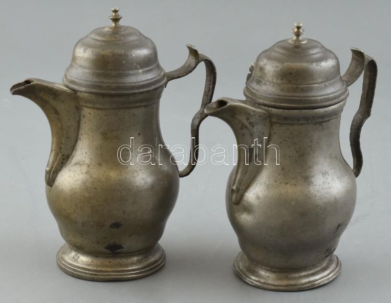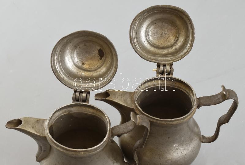 Leírás: Régi ón kanna pár, kopott, horpadásokkal és deformációkkal, m: 16 cm