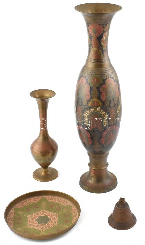 Leírás: Réz váza, zománcozott díszítéssel, kopásnyomokkal, 2 db, m: 46,5 és 24 cm + fém csengő, m: 6,5 cm + réz tálca, d: 18 cm