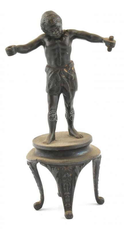 Leírás: Széken álló fiú figura, fém, hiányos, m: 19,5 cm