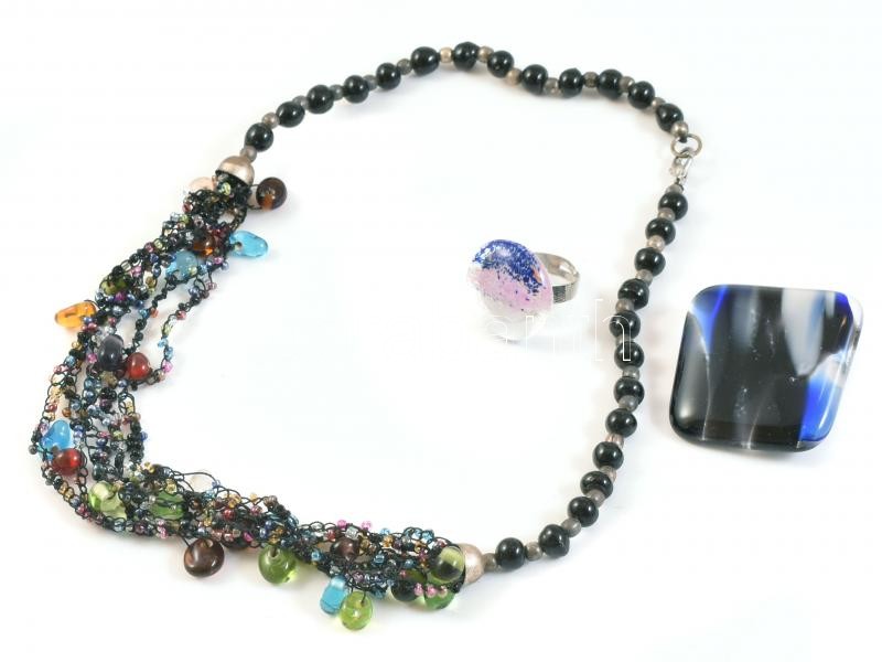 Leírás: Színezett üveg nyaklánc, gyűrű és kitűző
