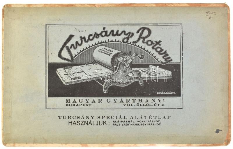 Leírás: Turcsány speciál alétlap, aláíráshoz, vonalazáshoz, rajz vagy hangjegy íráshoz, Turcsány Rotary reklámmal, kopott, 35x22 cm