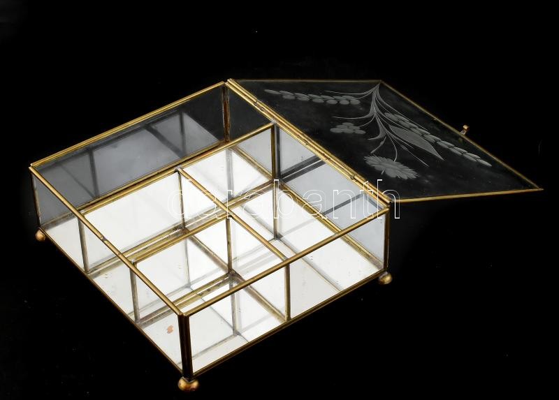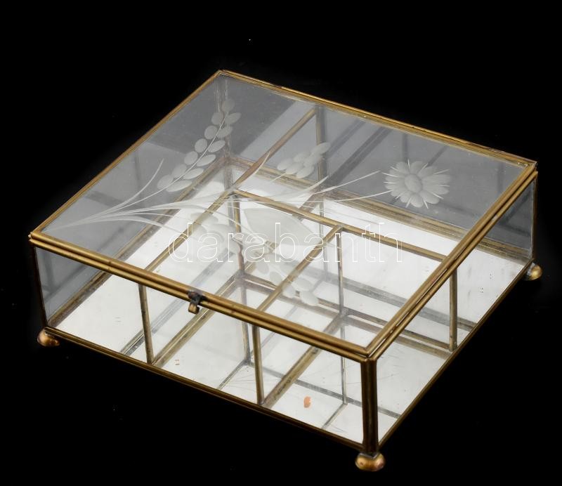 Leírás: Üveg és fém tükrös doboz virágos díszítéssel, kissé kopottas, 18,5x16,5x6,5 cm