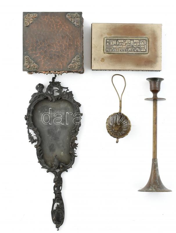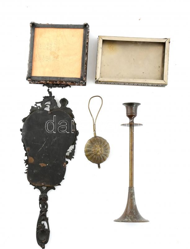Leírás: Vegyes fém bolhatétel. (Doboz 2db, teaszűrő, gyertyatartó, kézi tükörkeret) Kopott, sérült.