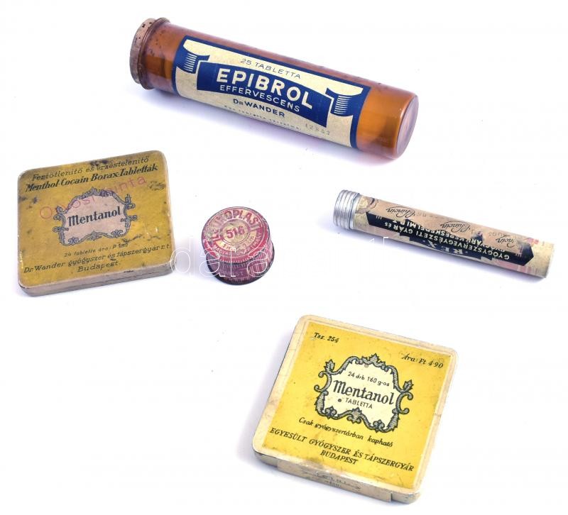 cca 1940-50 össz. 5 db dobozka és fiola: 2 db Mentanol fém dobozka (államosítás előtti és utáni), Dr. Wander Epibrol tabeltta üveg fiola tartalommal, Beiersdorf Leukoplast fém dobozka stb.