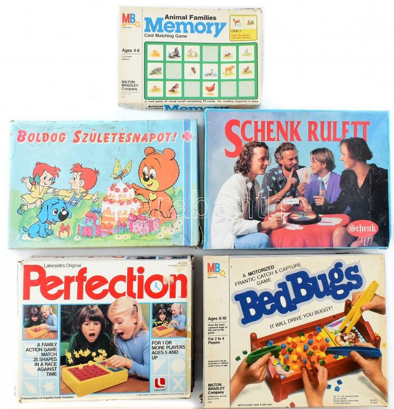 Leírás: Vegyes retro társasjáték tétel, 5 db: Animal Families memory card matching game, Perfection, Bed Bugs, Schenk rulett, Bussi Bär Boildog Születésnapot. Eredeti, sérült, részben foltos kartondobozában. Hiányos.