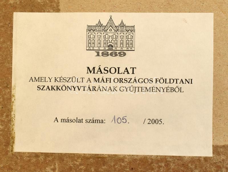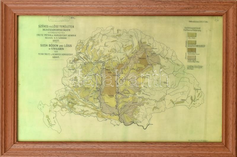 Üvegezett fa képkeret "Székes és lösz területek Magyarországon, 1897" térkép modern másolatával, amely hátoldali címke szerint készült a MÁFI Országos Földtani Szakkönyvtárának gyűjteményéből, másolat száma: 105/2005. Éleinél apró sérülésekkel. Belső méret: 30,5x49 cm.