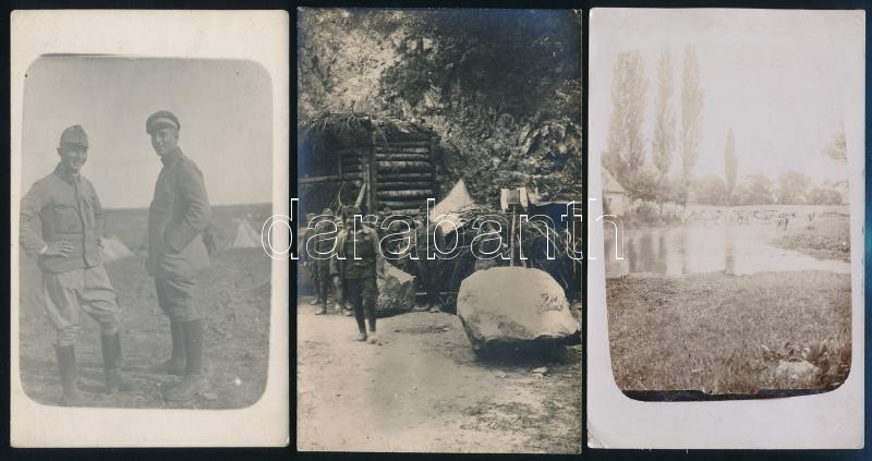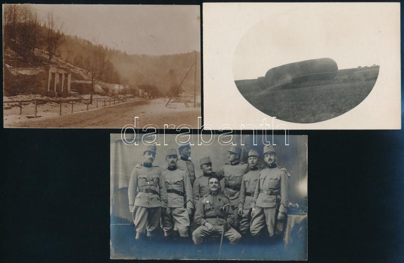 Leírás: 6 db I. világháborús katonai fotó és fotólap feliratozva, közötte megfigyelő léggömb