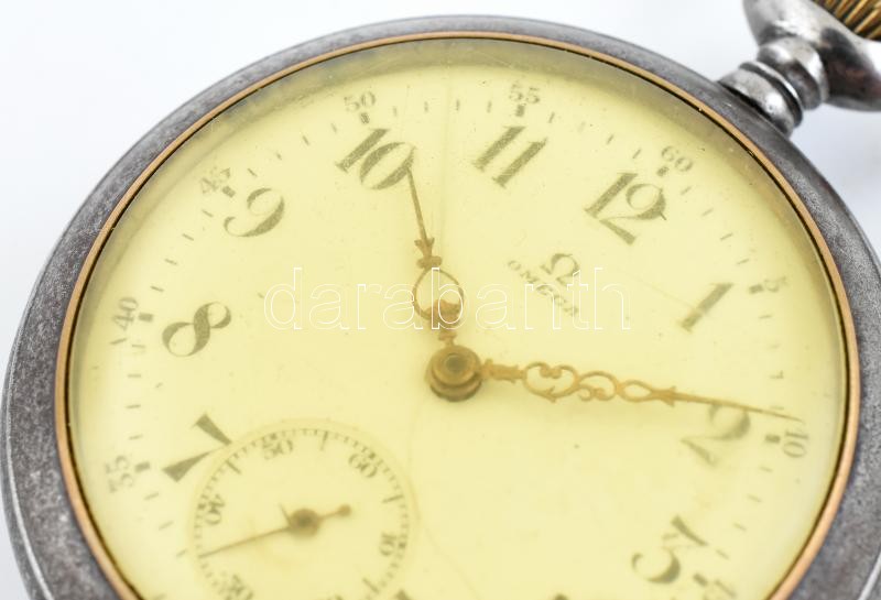 Leírás: Omega zsebóra, jelzett tok, jelzett szerkezet, sérült számlap. Tisztításra szorul d: 50 mm