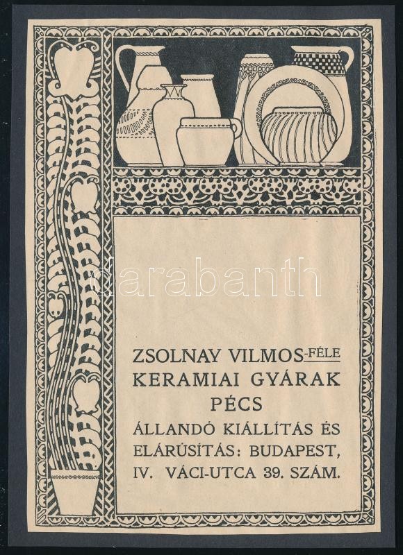 cca 1900-1910 Zsolnay Vilmos-féle keramiai gyárak Pécs, szecessziós Zs... https://www.darabanth.com/hu/399-Gyorsarveres/399.0/Mutargy-papirregiseg-egyeb/Reklam~500024/cca-1900-1910-Zsolnay-Vilmos-fele-keramiai-gyarak-Pecs-szecesszios-Zsolnay-reklam-papir-kart~II2440054