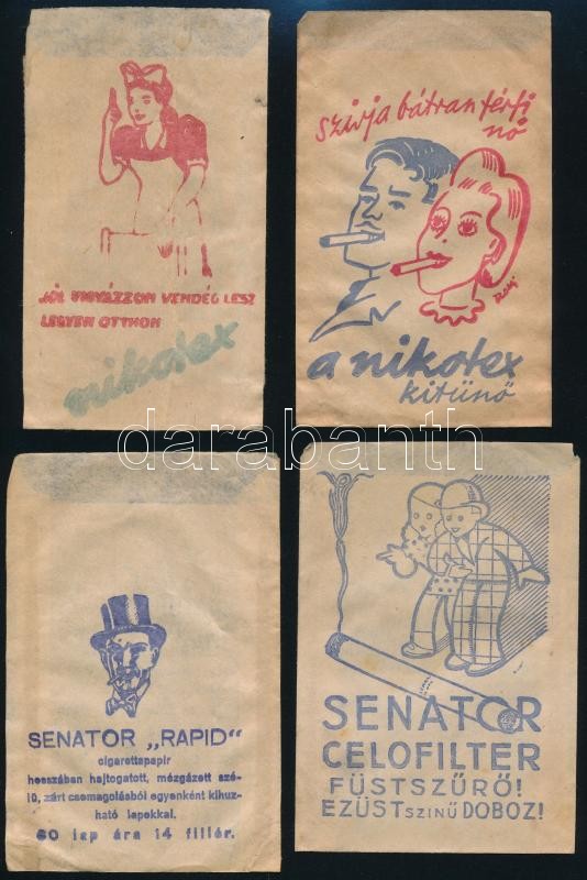 Leírás: cca. 1930, 4 db Nikotex és Senator cigaretta reklámos trafik papírtasak.