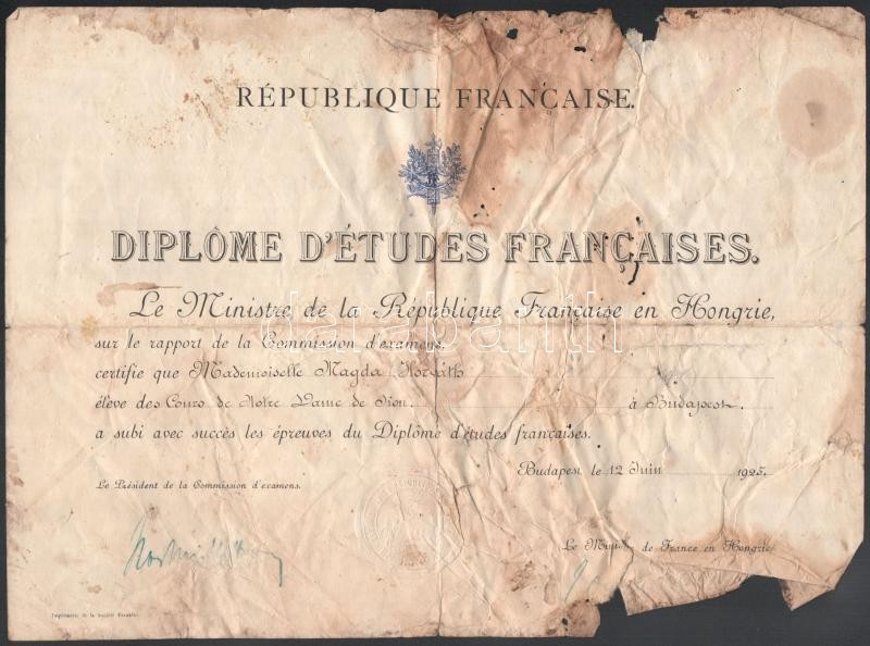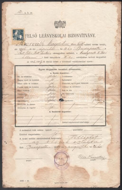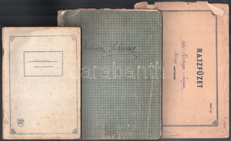 cca 1900-40 Vegyes kézirat és okmány tétel: Gyorsírással teleírt füzet, bibliai részletekkel; Felső leányiskolai bizonyítvány, 1919, Bp., sérült, foltos; 2 db füzet kézzel írt versekkel, hiányos,;