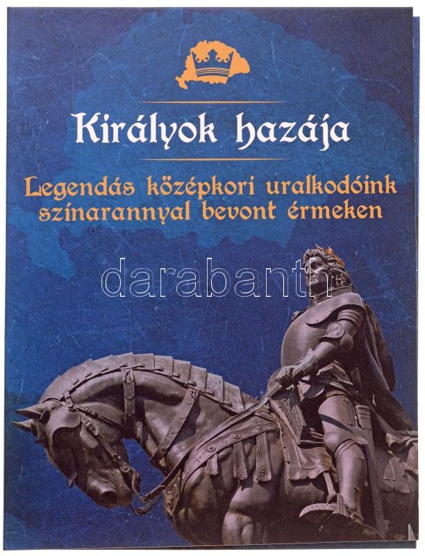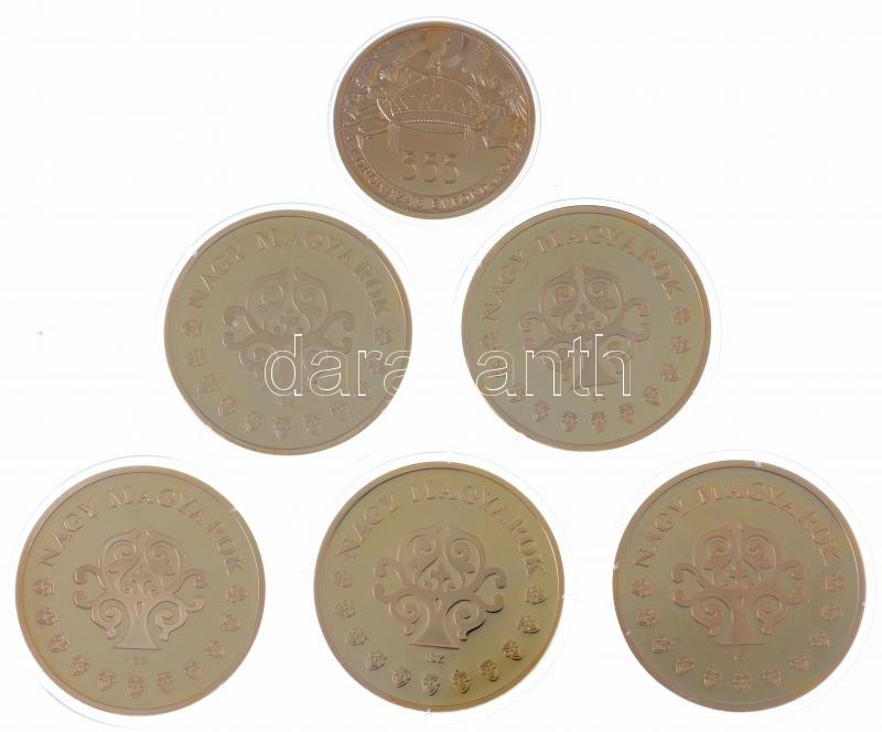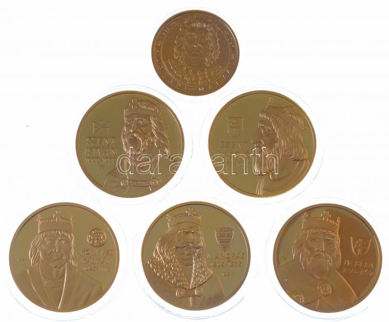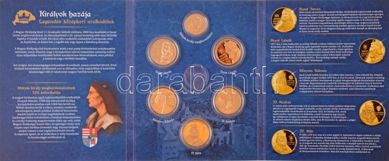 ifj. Szlávics László (1959-) DN "Nagy Magyarok" 5xklf aranyozott Cu-Ni emlékérem (Szent István, Szent László, Könyves Kálmán, II. András, IV. Béla) + 2019. "Hunyadi Mátyás 1464-1490. / A koronázás 555. évfordulója" aranyozott Cu-Ni emlékérem, "Királyok hazája" gyűjtői mappában T:PP