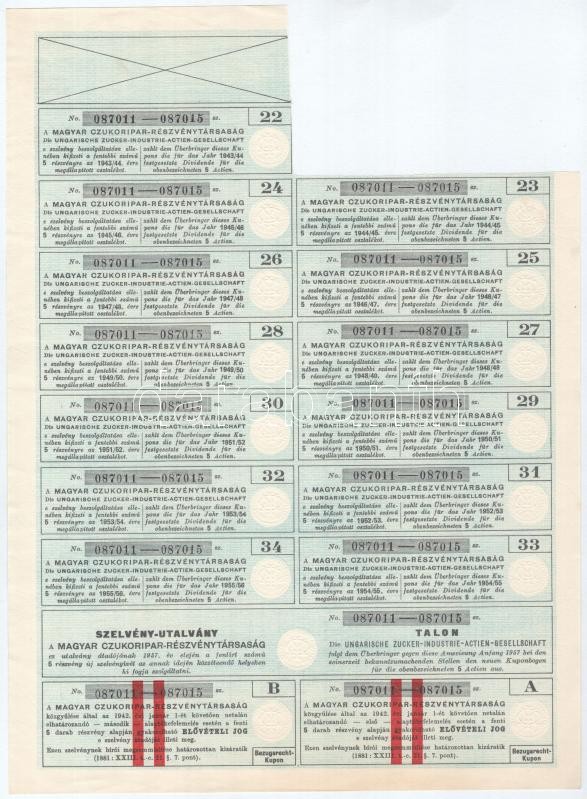 Leírás: Budapest 1923. "Magyar Czukoripar Részvénytársaság" 5 részvénye egyenként 600K-ról, szelvényekkel, szárazpecséttel és bélyegzésekkel T:III