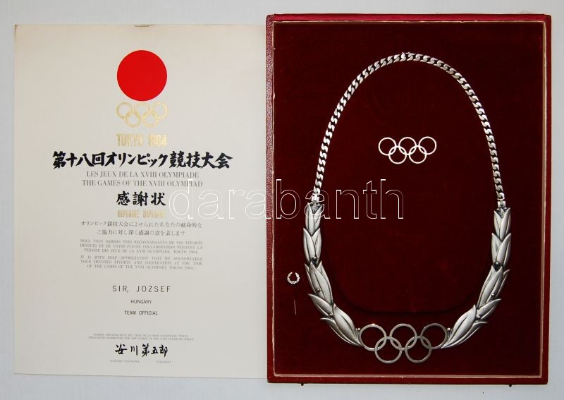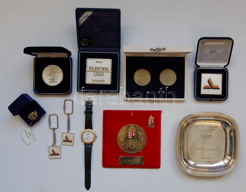 Dr. Sír József hagyatéka - fém emléklap Thaiföld Olimpiai Bizottságától + 1964. Tokyo-i Olimpia-diploma, mindkettő olimpiai komité elnökének aláírásával + Ag (Bertoni) Olimpiai kitüntetés (lánc formájú) Samaranch-tól-csak igen kevés példányszámban készült és kevesen kapták meg RRR!!! + 1987. C.I.O. emléktál Ag Samaranch bevésett aláírásával + Magyar Olimpiai Érdemérem hozzávaló kitűzővel + extra nagyméretű emlékplakett a római olimpiai stadion és "Italia" ábárzolásával + 1973+1974. DDR olimpiai témájú érempár díszdobozban + Magyar Olimpiai Bizottság aranygyűrűje díszdobozban R! + 2 klf 1983+1984. IAAF nagyméretű fémplakett + 2 klf Ag (Bertoni) IAAF plakett + 2 db IAAF kulcstartó + IAAF Seiko karóra + IAAF plakett + Tokyo 91 IAAF Ag plakett díszdobozban / Nachlass von Dr. József Sír - metall Gedenkblatt (Thailand/Olimpische Komitee) + 1964. Diplom Tokyo/Olimpia + Olimpische Halskette nur einige (sehr wenig) Exemplare existieren RRR!!! + Erinnerungsschal gewidmet von Samaranch + Ungarische Olimpische Komitee Au Ring R! + verschiedene seltene Ag Plakett, Uhr usw.