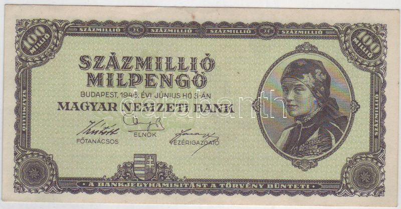 1946. 100.000.000Milpengő T:I https://www.darabanth.com/hu/40-Gyorsarveres/40.0/Numizmatika/Kulfoldi-es-magyar-bankjegyek~170/1946-100000000Milpengo-TI~II78155