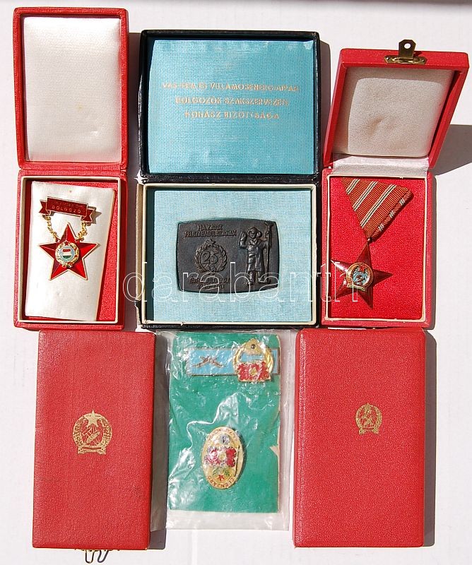 1950-es évektől 38 db szocialista kitüntetés, plakett részben eredeti dobozban + 2 üres doboz, sok jobbal + zacskónyi régi és új szalag T:többnyire 1,2