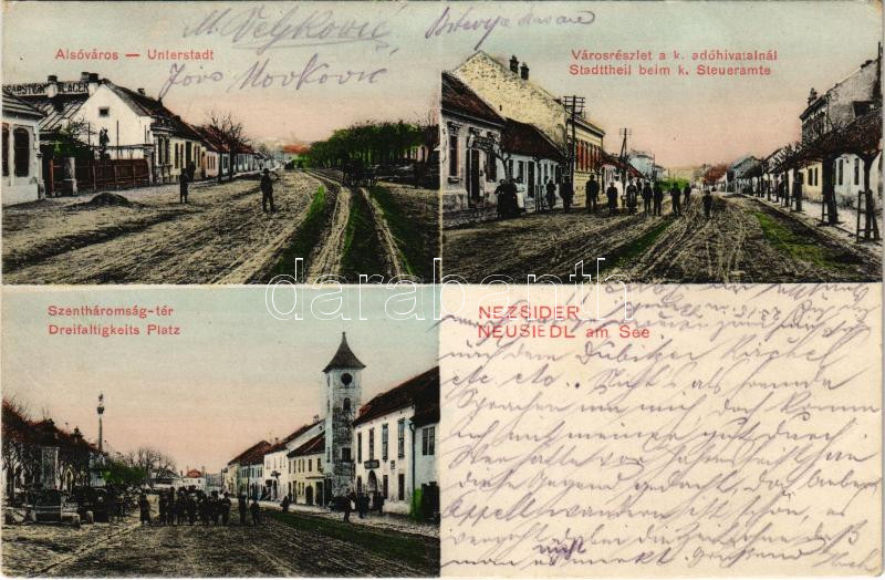 1912 Nezsider, Neusiedl am See; Alsóváros, utca részlet az adóhivatalnál, Szentháromság tér, üzletek. Horváth J. kiadása / Unterstadt, Stadtteil beim k. Steueramte, Dreifaltigkeits Platz / street view, tax office, Holy Trinity Square, shops (EK)