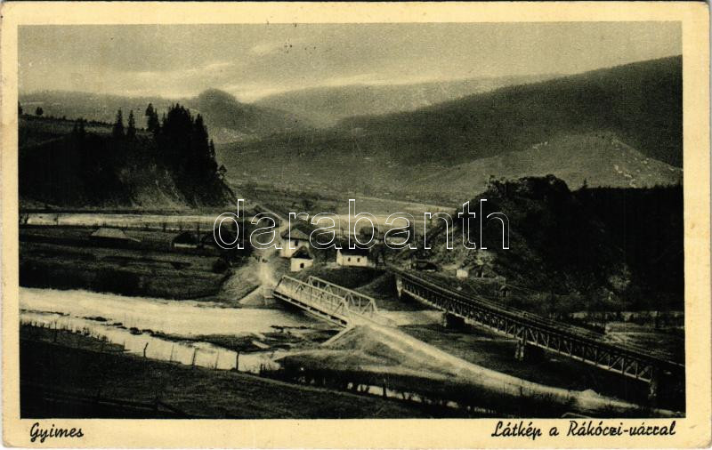 1942 Gyimes, Ghimes; Magyar-román országhatár a Rákóczi várrommal, vas... https://www.darabanth.com/hu/40-Nagyaukcio/40.1/Kepeslapok/Erdely~16469/1942-Gyimes-Ghimes-Magyar-roman-orszaghatar-a-Rakoczi-varrommal-vasuti-hid-castle-ruins~II2871378