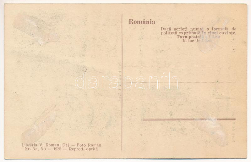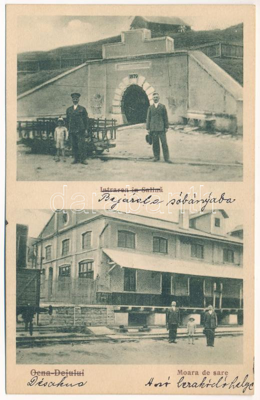 Désakna, Ocna Dejului; Sóbánya, Lajos tárna 1879, iparvasút, csille, sómalom. V. Roman Nr. 5a,5b. 1935 / Intarea in Salina, Moara de sare / salt mine, industrial railway, salt mill (ragasztónyomok / gluemarks)