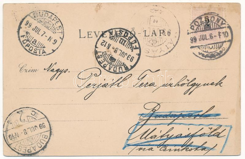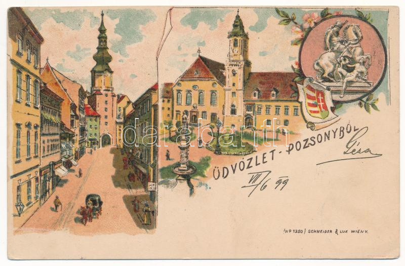 Leírás: 1899 (Vorläufer) Pozsony, Pressburg, Bratislava; Mihály kapu utca, Városháza. Schneider & Lux / street, gate, town hall. Art Nouveau, floral, litho (EK)