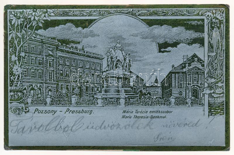 Leírás: 1900 Pozsony, Pressburg, Bratislava; Mária Terézia emlékszobor. Szecessziós fémes fóliás hatású képeslap / monument. Art Nouveau, floral, metallic foil (EK)