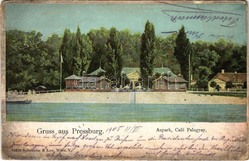 1905 Pozsony, Pressburg, Bratislava; Aupark Palugyay Café / Palugyay L... https://www.darabanth.com/hu/40-Nagyaukcio/40.1/Kepeslapok/Felvidek~16470/1905-Pozsony-Pressburg-Bratislava-Aupark-Palugyay-Cafe-Palugyay-Ligeti-Kavehaz-Schneider-~II2857720