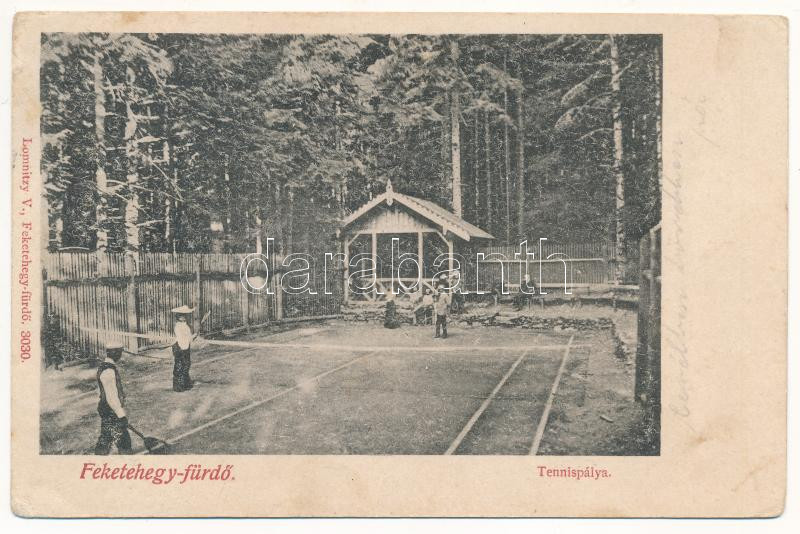 Leírás: 1907 Feketehegyfürdő, Feketehegy, Cernohorské kúpele (Merény, Vondrisel, Nálepkovo); tenisz pálya. Lomnitzy V. kiadása / tennis court, sport (ázott / wet damage)