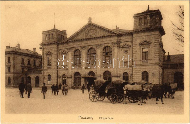 Pozsony, Pressburg, Bratislava; Pályaudvar, vasútállomás, lovas hintók... https://www.darabanth.com/hu/40-Nagyaukcio/40.1/Kepeslapok/Felvidek~16470/Pozsony-Pressburg-Bratislava-Palyaudvar-vasutallomas-lovas-hintok-railway-station-horse~II2877732