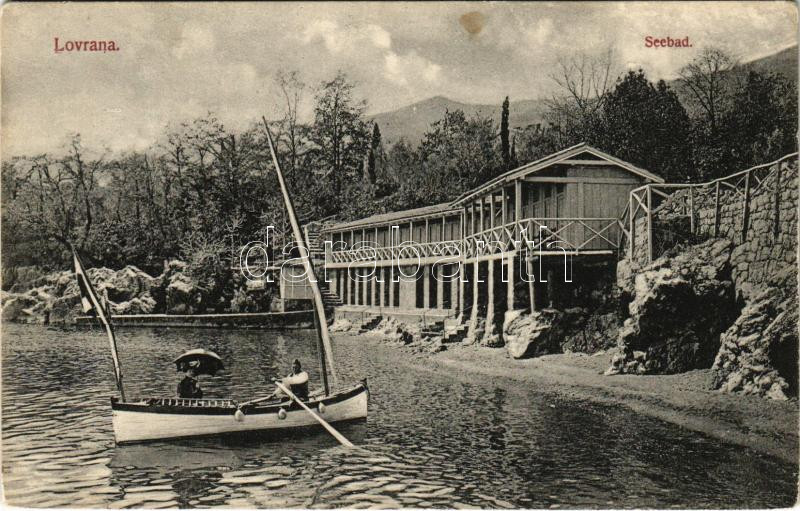 1908 Lovran, Lovrana; Seebad / beach, boat (Rb) https://www.darabanth.com/hu/40-Nagyaukcio/40.1/Kepeslapok/Horvatorszag~16472/1908-Lovran-Lovrana-Seebad-beach-boat-Rb~II2858848