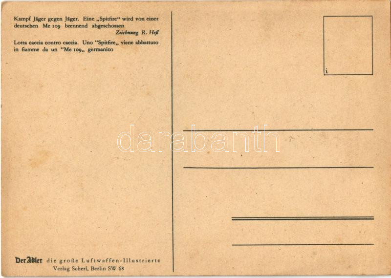 Kampf Jäger gegen Jäger. Eine Spitfire wird von einer deutschen Me 109 brennend abgeschossen. Der Adler die grosse Luftwaffen-Illustrierte / German WWII military aircraft / Német második világháborús katonai repülőgép s: R. Hess (EB)