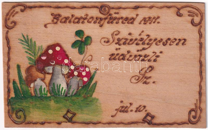 1911 Balatonfüred. Gombás üdvözlőlap, kézzel festett falemez lap https://www.darabanth.com/hu/40-Nagyaukcio/40.1/Kepeslapok/Magyarorszag~16468/1911-Balatonfured-Gombas-udvozlolap-kezzel-festett-falemez-lap~II2856684