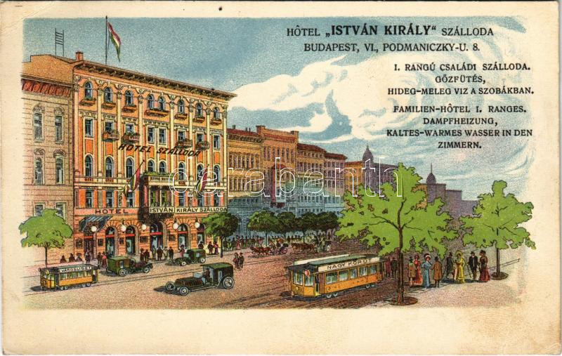 1912 Budapest VI. István Király szálloda, villamosok, automobil, reklá... https://www.darabanth.com/hu/40-Nagyaukcio/40.1/Kepeslapok/Magyarorszag~16468/1912-Budapest-VI-Istvan-Kiraly-szalloda-villamosok-automobil-reklam-Podmaniczky-utca-8-Gra~II2873904