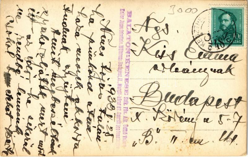 Leírás: 1933 Balatonkenese, Szék. főv. alk. üdülő telepe, kikötő, gőzhajó a kikötőben. Keller János felvétele, photo (fl) + "KESZTHELY-BUDAPEST 48." vasúti mozgóposta
