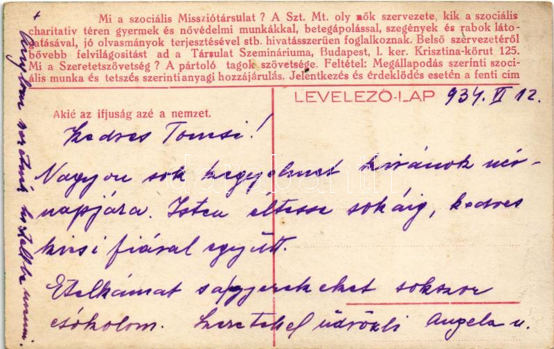 Leírás: 1934 Budapest XII. Szociális Missziótársulat Bethánia Gyermekotthona. Németvölgyi út 49. (Rb)
