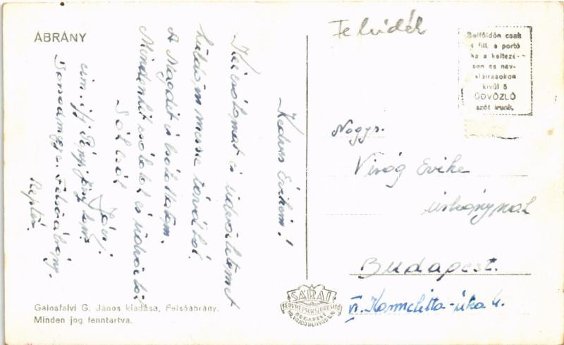 Leírás: Bükkábrány, Ábrány; Patak, Hősök emlékköve, községháza, Hangya fogyasztási szövetkezet üzlete. Galosfalvi G. János kiadása Felsőábrány