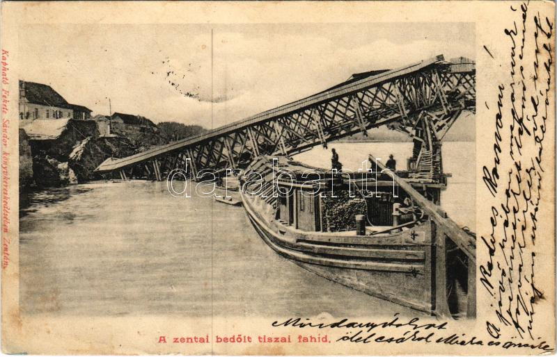 1902 Zenta, Senta; Bedőlt tiszai fahíd, halászbárka. Fekete Sándor kia... https://www.darabanth.com/hu/40-Nagyaukcio/40.1/Kepeslapok/Vajdasag~16473/1902-Zenta-Senta-Bedolt-tiszai-fahid-halaszbarka-Fekete-Sandor-kiadasa-collapsed-wooden-~II2860329