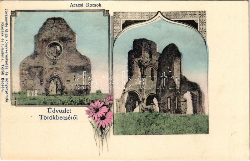Leírás: Törökbecse, Újbecse, Novi Becej; Aracsi templom romok. Jovanovits Giga kiadása / church ruins in Vranjevo (Araca). Art Nouveau, floral